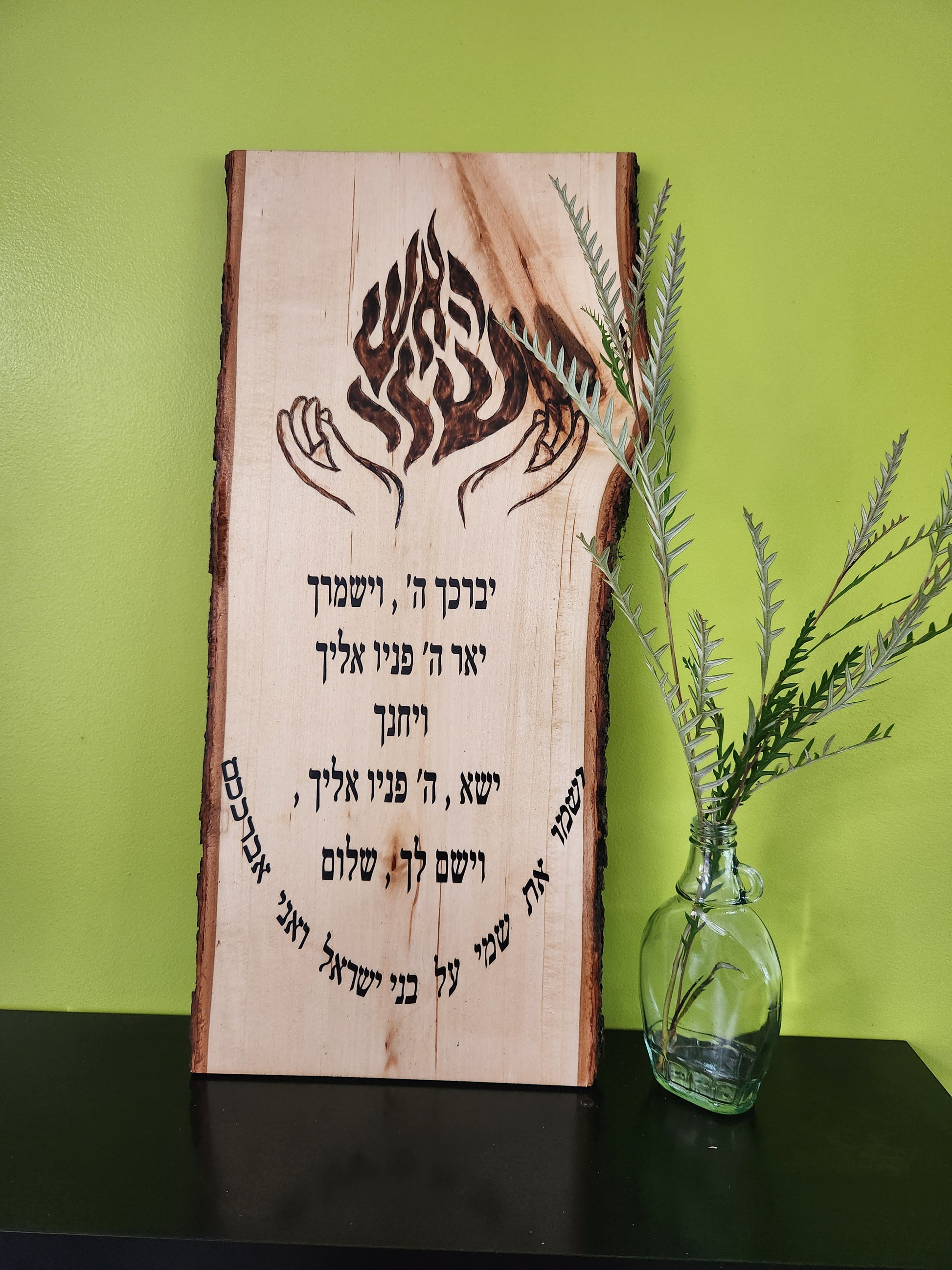 This is a one-of-a-kind, handmade artwork created on a 23x10x0.83-inch basswood plank with a live edge. The entire lyrics of a blessing are carefully crafted using high-quality permanent vinyl. The picture is also wholly handmade using a woodburning tool and sealed with a clear protective coat to ensure its long-lasting