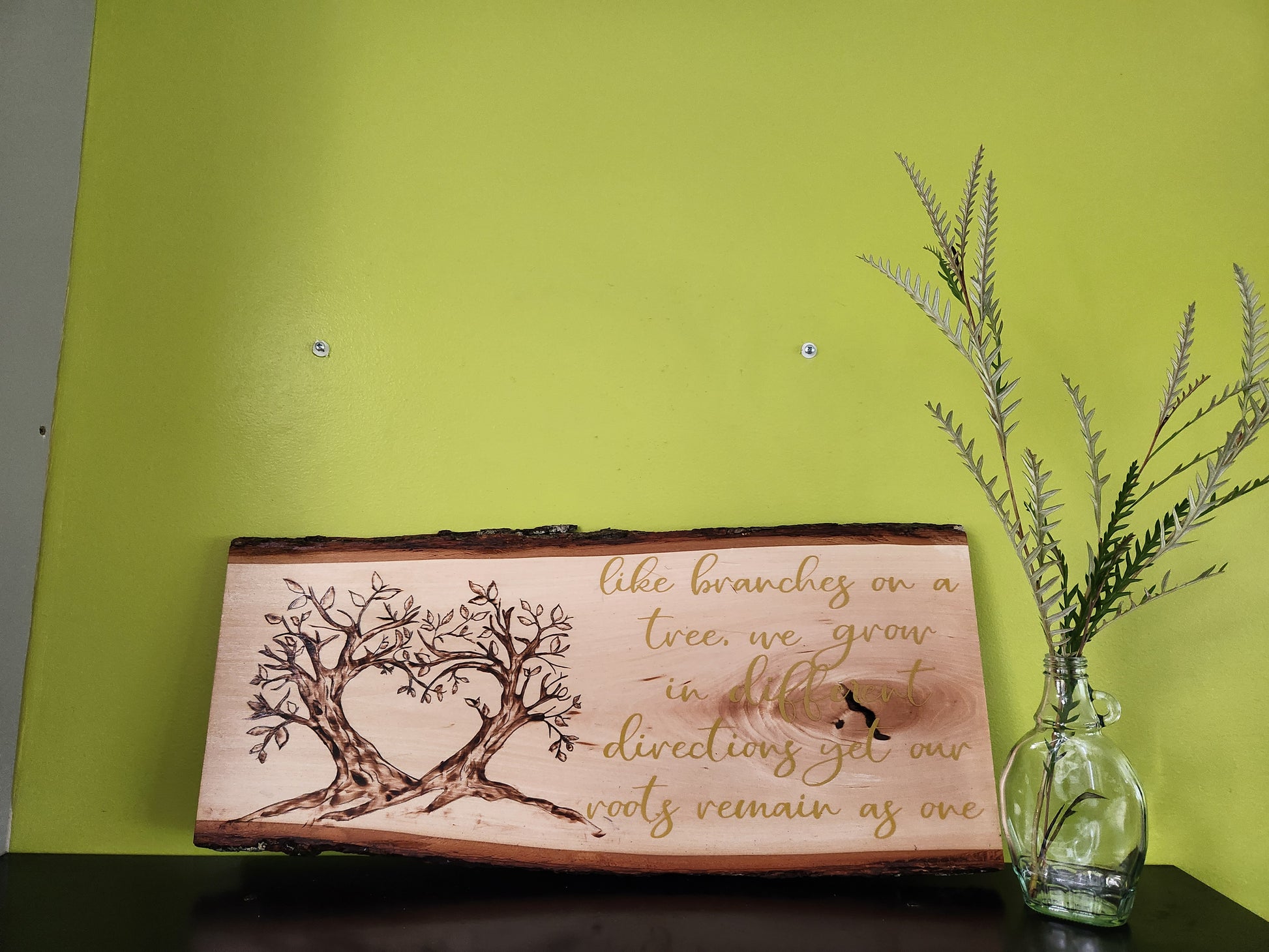 This is a one-of-a-kind handmade artwork made on a 23x10x0.83-inch basswood plank featuring a live edge. The entire lyrics are carefully crafted using high-quality permanent vinyl. The picture is also wholly handmade using a woodburning tool and sealed with a clear protective coat to ensure its long-lasting quality.