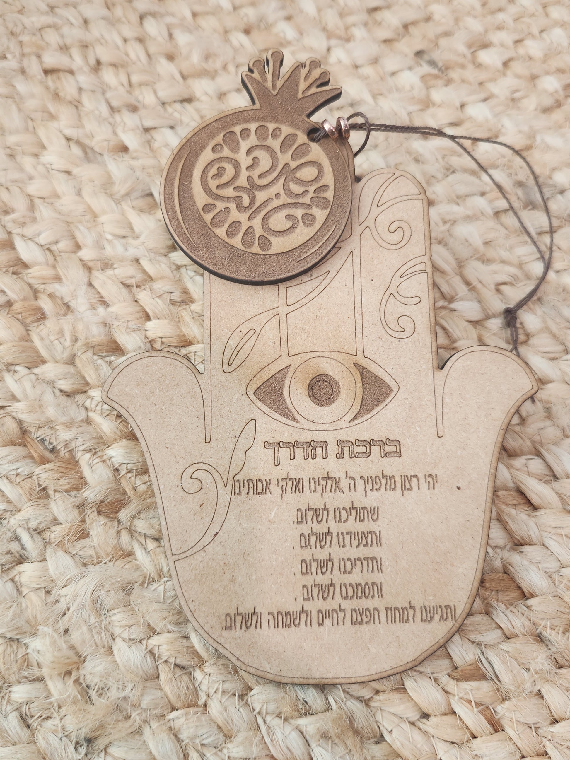 Small hamsa with road blessing for safe trip made on basswood 1\8 (3mm) 4" - 5.5". Sealed with a clear protective coat to ensure its long-lasting quality.